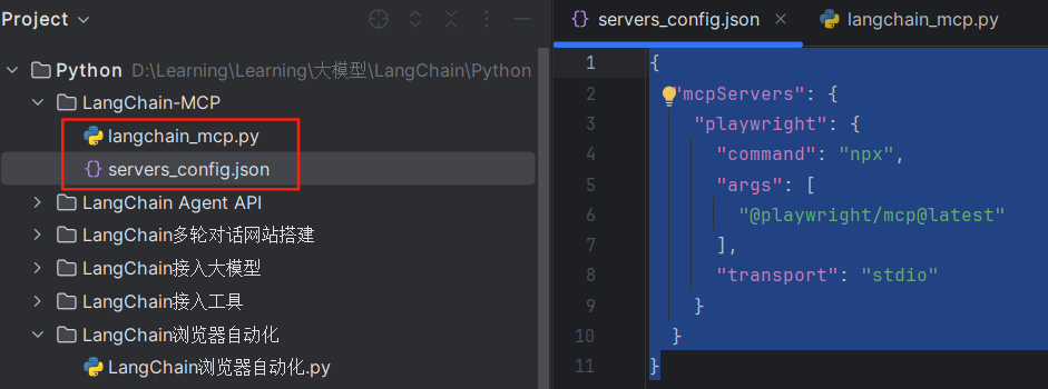 servers_config.json文件,在mcp汇总网站(https://mcp.so/server/playwright-mcp/microsoft?tab=tools)中找到PlayWright的配置并写入servers_config.json文件中,同时添加MCP通信方式的配置项transport。servers_config.json完整内容如下, 基本原理是通过npx下载PlayWright MCP Server到本地并通过stdio方式与LangChain搭建的MCP Client进行通信。
