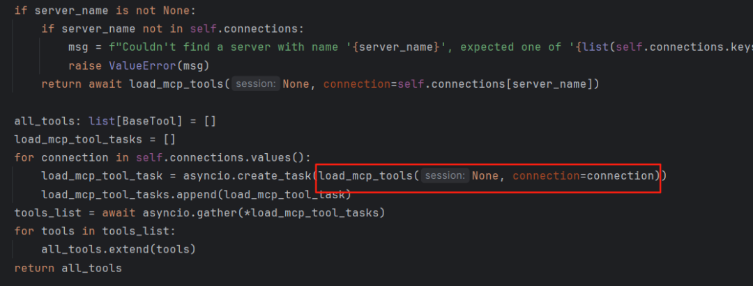 以上代码中的关键部分是LangChain连接MCP Server,首先通过mcp_client = MultiServerMCPClient(servers_cfg)创建MCP Server连接对象,其次通过mcp_client.get_tools()将连接后的MCP Server中的方法全部转换为LangChain可用的工具函数。我们查看mcp_client.get_tools()的源码,可以看到内部调用了load_mcp_tools()函数一键将连接MCP Server的所有工具函数转化为标准的LangChain工具函数,所以可以直接在LangChain环境中进行使用: