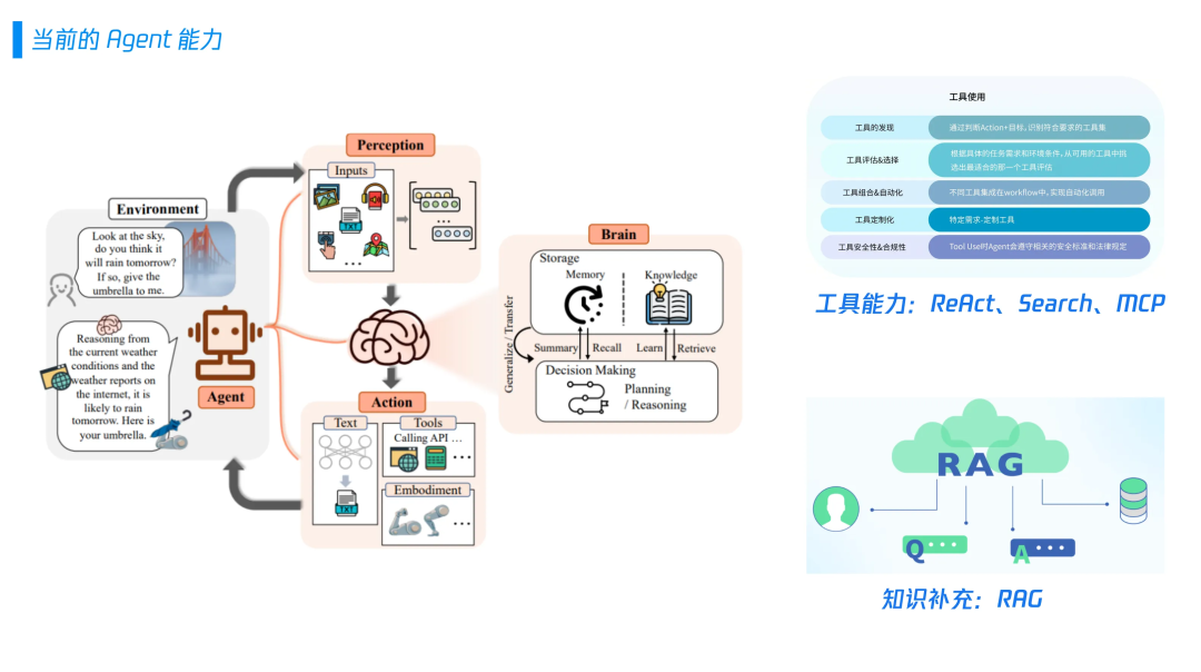 总之,当前的 AI 智能体通过整合计算能力、知识记忆、预测功能和动作执行等多个方面,能够高效地与外部用户进行交互,并完成复杂的任务。这些能力的实现依赖于各种工具和接口的使用,例如 API 调用、SQL 调用和机械手操作等。通过 MCP 和 RAG 等机制,AI 智能体能够更加灵活地调用和补充知识,从而提升整体性能。