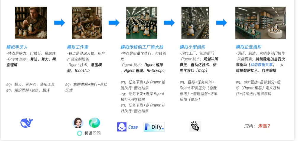 流水线阶段的特点是批量化执行和拉线管理。在工厂中,每个流水线都有专门的管理人员监督工作进度,确保生产环节顺利进行。对应的 AI 智能体技术包括任务编排、管理和 AI-Devops。例如,任务分发后可以通过多种方式执行并回收结果。产品示例包括豆包的 Coze 平台和 Dify 平台。