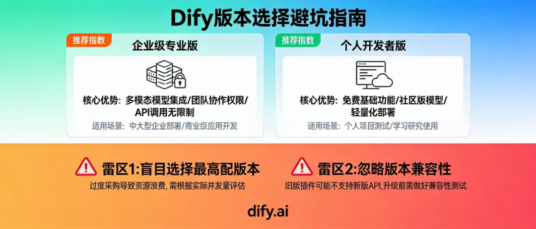 - 关注官方更新日志:定期查看Dify官方发布的更新日志,了解新版本的功能特性、修复的问题和优化的内容,以便及时选择适合业务需求的版本。