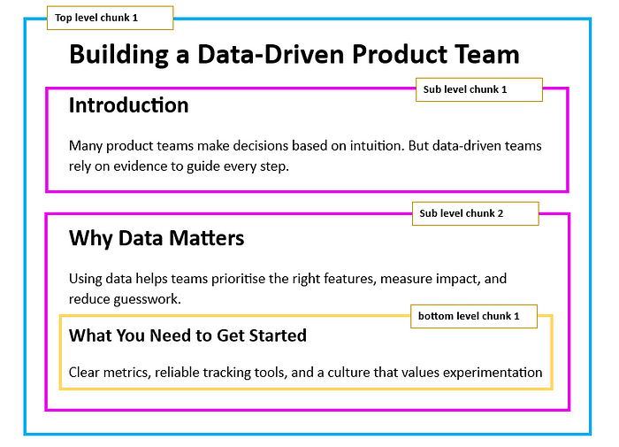 - 场景使用: 适用于具有清晰的章节、小节和标题层级的文档,例如技术手册、教科书、研究论文、长篇报告、企业知识库文档。当你希望用户能够根据文档的自然逻辑结构进行检索,或者LLM需要理解某个特定章节的完整语境时,这种方法是首选。它也是实现分层切块(Hierarchical Chunking)的基础。