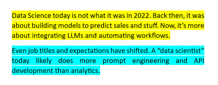 # pip install sentence-transformersfrom sentence_transformers import SentenceTransformer# 加载一个预训练的句子嵌入模型 (首次运行可能需要下载)try: embedding_model = SentenceTransformer('all-MiniLM-L6-v2')except Exception: print("Failed to load sentence-transformers model. Please ensure you have internet or download it manually.") # 提供一个备用/跳过策略 embedding_model = Nonedef embedding_chunking(text, model=embedding_model, similarity_threshold=0.7): """ 先嵌入所有句子,然后根据相似度聚合。 """ if model isNone: print("Embedding model not loaded, skipping embedding chunking demo.") return [text] # 返回原始文本或进行其他默认切块 sentences = sent_tokenize(text) if len(sentences) <= 1: return sentences sentence_embeddings = model.encode(sentences) chunks = [] current_chunk_sentences = [sentences[0]] for i in range(1, len(sentences)): # 计算当前句子与前一个句子嵌入的余弦相似度 similarity = cosine_similarity([sentence_embeddings[i]], [sentence_embeddings[i-1]])[0][0] if similarity < similarity_threshold: # 如果相似度低,则认为语义不连续,结束当前块 chunks.append(" ".join(current_chunk_sentences)) current_chunk_sentences = [sentences[i]] else: current_chunk_sentences.append(sentences[i]) if current_chunk_sentences: # 添加最后一个块 chunks.append(" ".join(current_chunk_sentences)) return chunksprint("\n--- 18. 嵌入切块 ---")if embedding_model: chunks_embedding = embedding_chunking(sample_text_long, similarity_threshold=0.5) # 调整阈值以观察不同效果 for i, chunk in enumerate(chunks_embedding[:3]): print(f"Chunk {i+1}:\n'{chunk}'") print("...")else: print("跳过嵌入切块演示,因为SentenceTransformer模型未加载。")