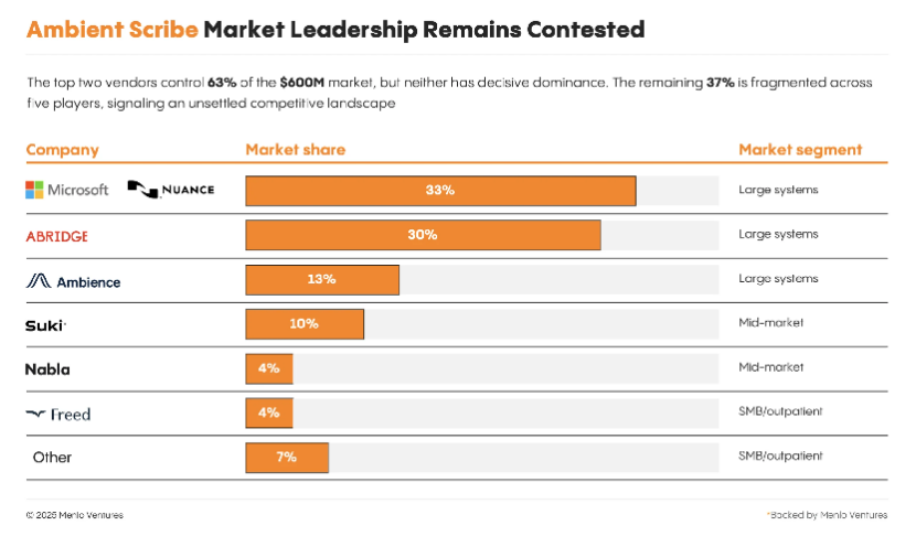 例如,在环境抄写领域,虽然微软的Nuance拥有类似产品,但Abridge、Ambience等初创公司仍然占领了近70%的新市场。