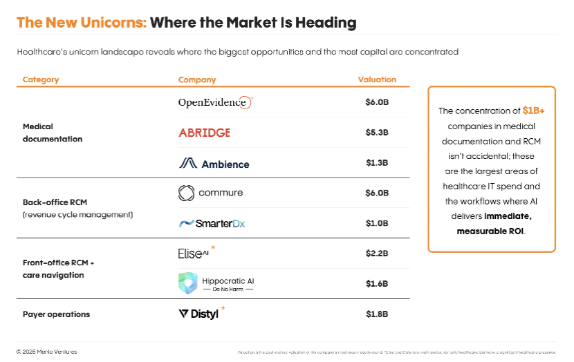 - 环境抄写(Ambient Scribes):AI医疗的首个突破领域,占据当下医疗保健AI市场的最大份额,近期诞生了两家独角兽Abridge和Ambience。
