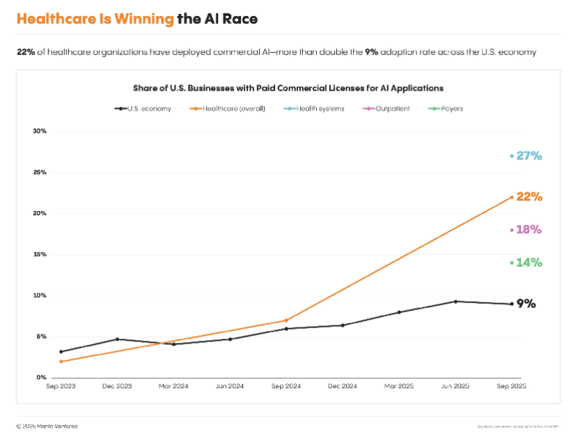 2023年9月,医疗保健AI的使用率仅为3%;到了2025年9月,这一数字上升至22%。