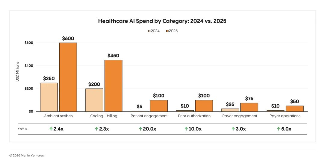 结果是,今年来医疗保健对于AI的支出达到了14亿美元,几乎是去年的两倍。