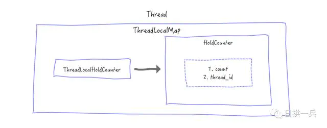 上述条件都满足了,也就会进入 tryAcquireShared 代码的第 14 行到底 25 行,这段代码主要是为了记录线程持有锁的次数。读锁是共享式的,还想记录每个线程持有读锁的次数,就要用到 ThreadLocal 了,因为这不影响同步状态 state 的值,所以就不分析了, 只把关系放在这吧