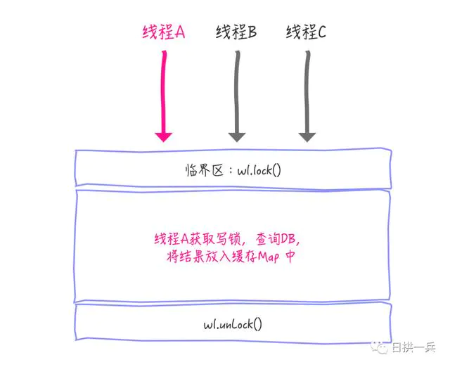 线程 A,B,C 同时执行到临界区 wl.lock(), 只有线程 A 获取写锁成功,线程B,C只能阻塞,直到线程A 释放写锁。这时,当线程B 或者 C 再次进入临界区时,线程 A 已经将值更新到缓存中了,所以线程B,C没必要再查询一次DB,而是再次尝试查询缓存中的值