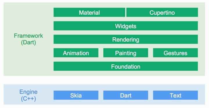 从架构中实际上已经能看出Flutter为什么快,至少相比之前的当红炸子鸡React Native快的原因了。