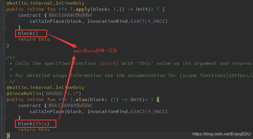 apply的block,没有参数,但是 also 则将this作为了参数。这么做造成的差异是: