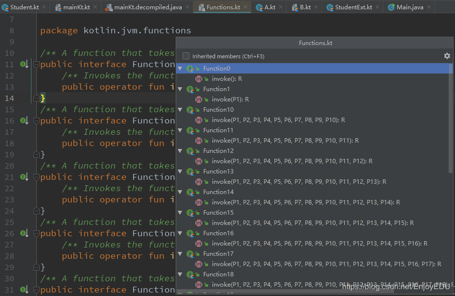 Function接口,Function2接口.....Function22接口。好了,不要质疑谷歌大佬的设计思路,反正大佬写的就是对的...这里用22个接口(至于为什么是22个,猜想是谷歌觉得不会有哪个脑子秀逗的开发者真的弄22个以上的参数挤在一起吧),表示kotlin开发中可能出现的lambda表达式参数列表。
