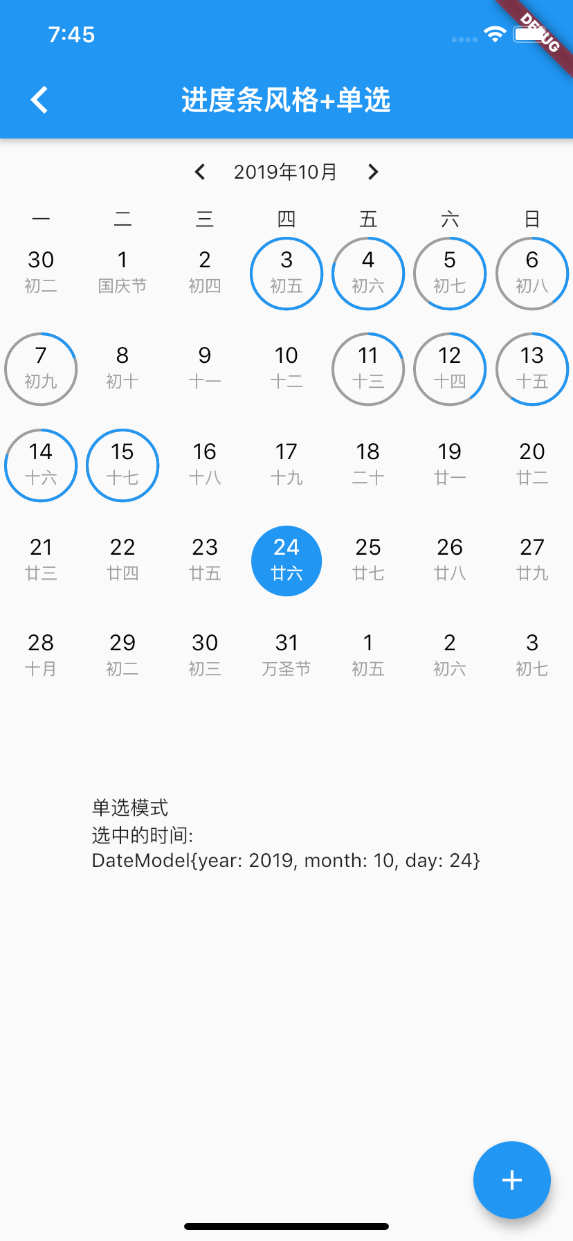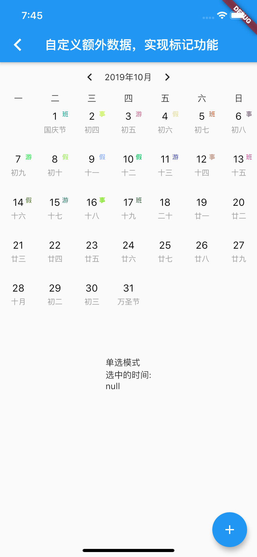 - 根据实际场景,可以给Item添加自定义的额外数据,实现各种额外的功能。比如实现进度条风格的日历,实现日历的各种标记