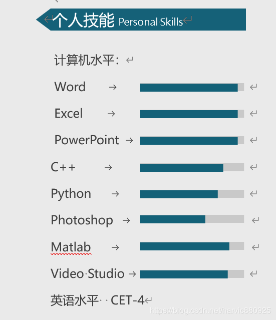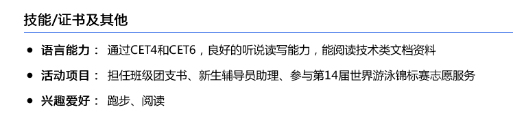 有些同学就玩躲猫猫特别好,把英语水平写在最后,而且跟其它信息夹杂在一起,标题也不语言、证书相关,HR就很容易遗漏,一旦遗漏就会认为你没有