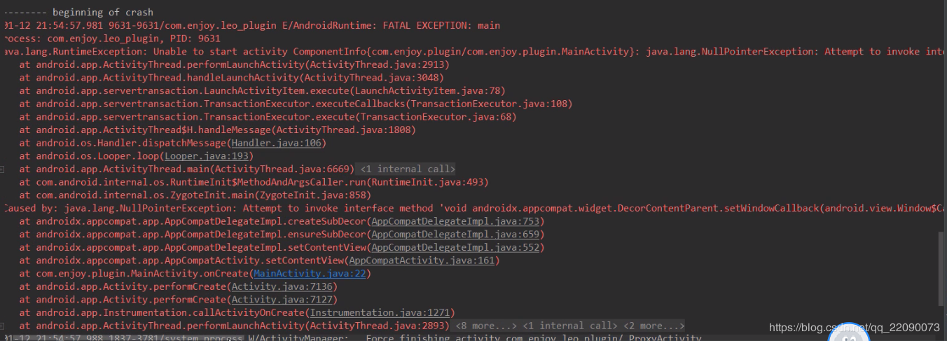 细心的同学发现,插件的Activity是继承自了Activity,如果想用AppCompatActivity的话是会报错的: