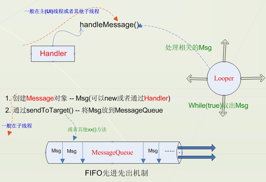 在文章的最后,附录一张草图,主要用于说明 Handler、Message、MessageQueue、Looper 之间的关系。