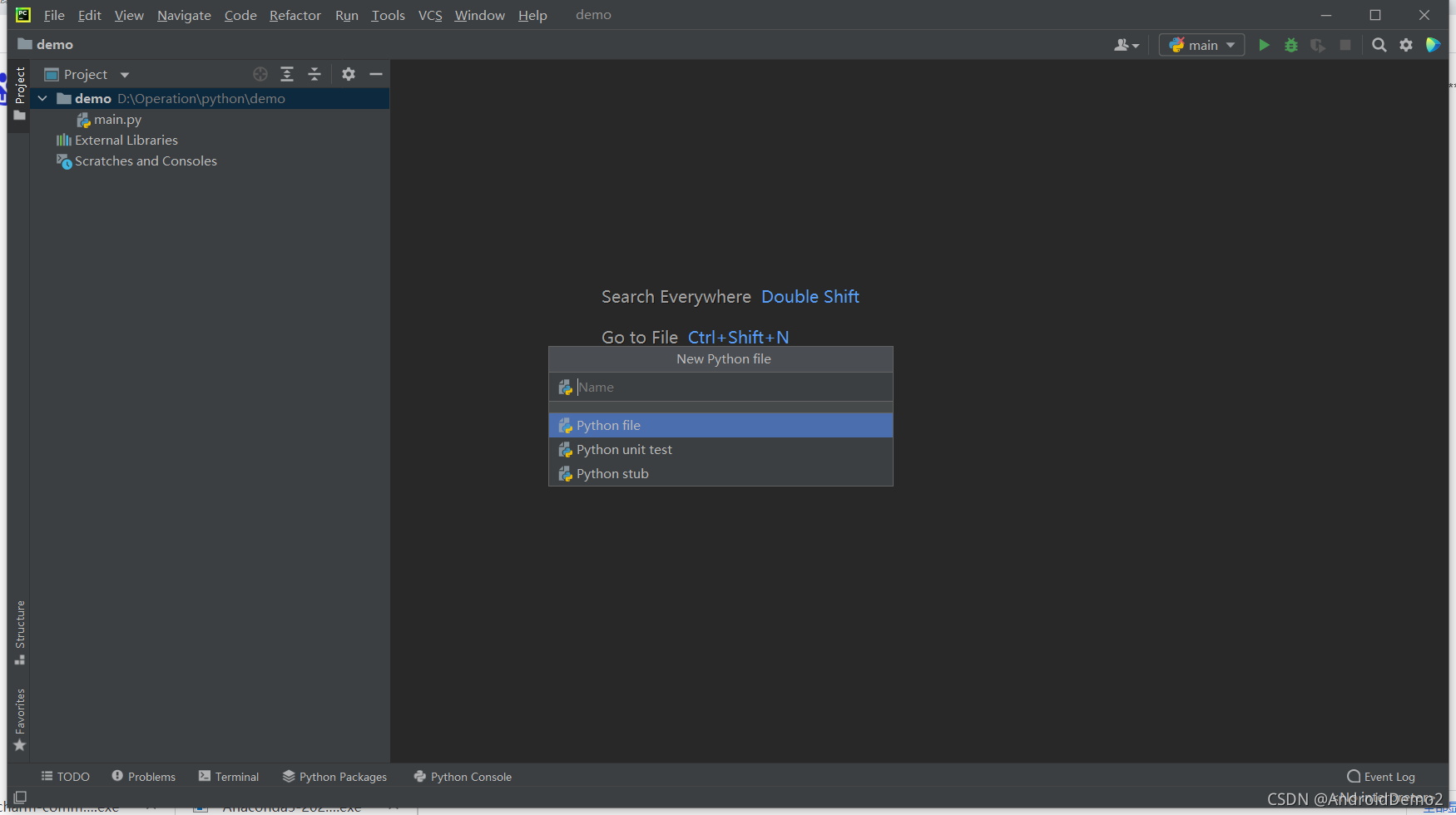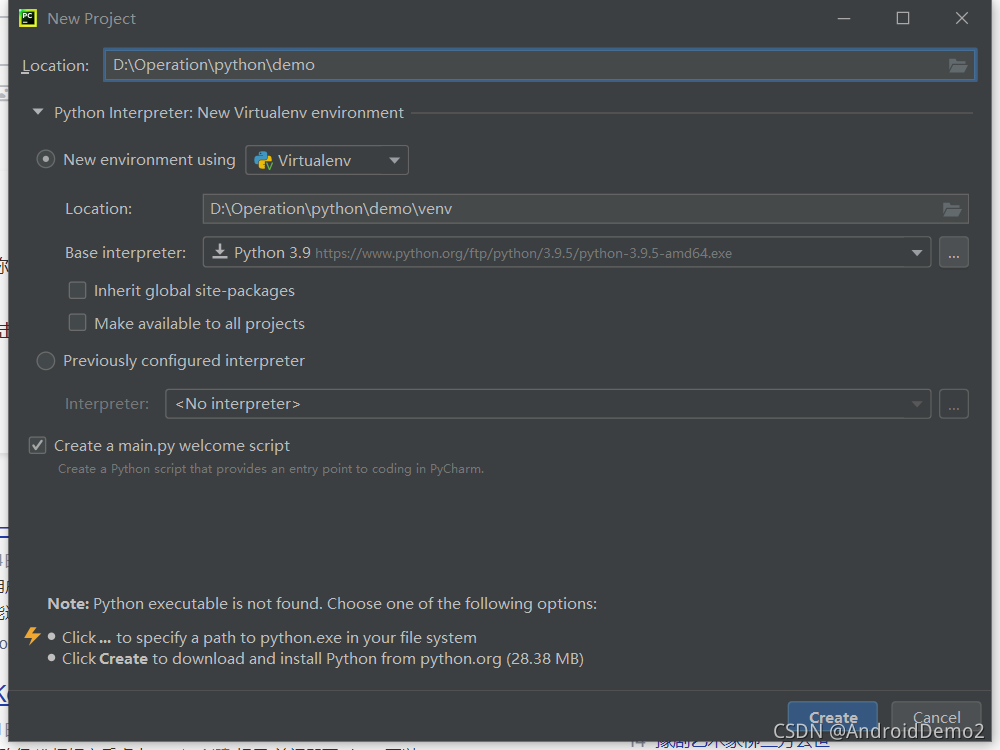 3. 创建第一个Python项目New Project,在第一行的Location可以修改项目的安装路径,安装在自己的项目文件夹。