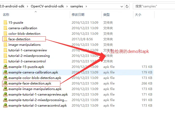 - samples:opencv代码案例里面包括了人脸检测和其他。