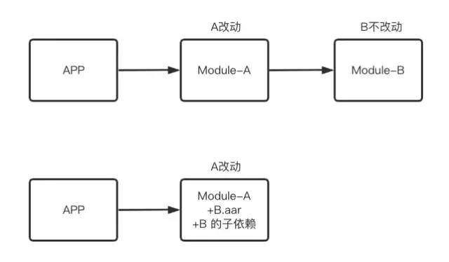 每一个 module 换变成 aar 之后,自身依赖的 child 依赖 (网络依赖,aar),给到 parent module (如何找到所有 parent module) ? 还是直接给 app module ? 有没有 app 到 module 依赖断掉的风险?这里需要出一个技术方案。