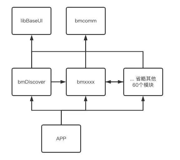 • 当 base/comm 模块改动,底部的所有模块都必须参与编译。因为 app/bmxxx 模块可能使用了 base 模块中的接口或变量等,并且不知道是否有改动到。(那么速度就非常慢)