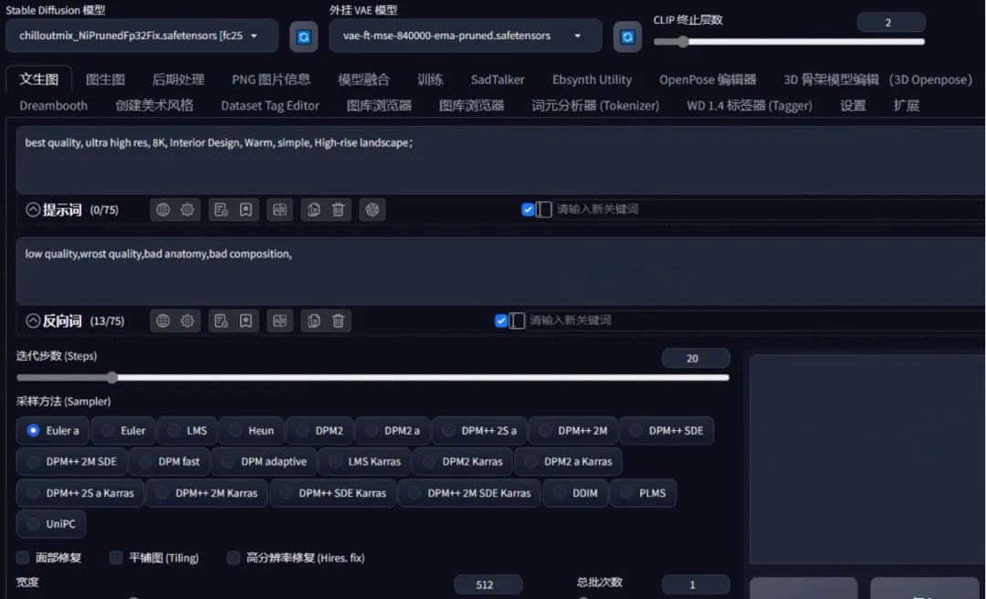 接着我们设置采样迭代步数Steps,默认为20,视不同图片尺寸和Stable