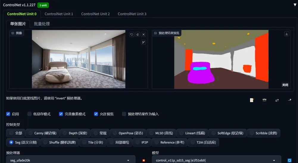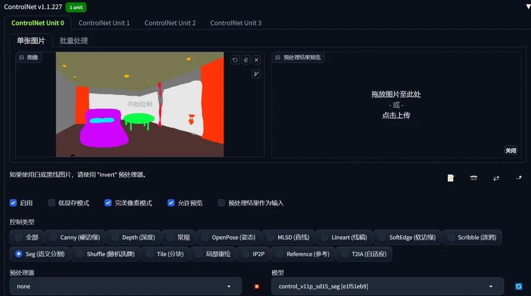 3.这里小编选择预处理器seg_ufade20k,点击启用、低显存模式(GPU显存8G以下推荐开启)、完美像素模式(Pixel