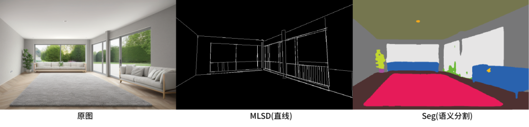 到这里小编感觉一定有很多小伙伴们要开始抱怨了,这么多的预处理器,用哪个啊。别担心,本篇中的演示只会运用到两种最具代表性的预处理器,MLSD(直线)和Seg(语义分割),选择它们两个,并按照小编的步骤,即便你只有一张随手拍摄的毛胚房照片,也能完成一副有高级既视感的室内装饰效果图。光看文字有点晦涩,让我们先来看下这两种预处理器的实际效果。