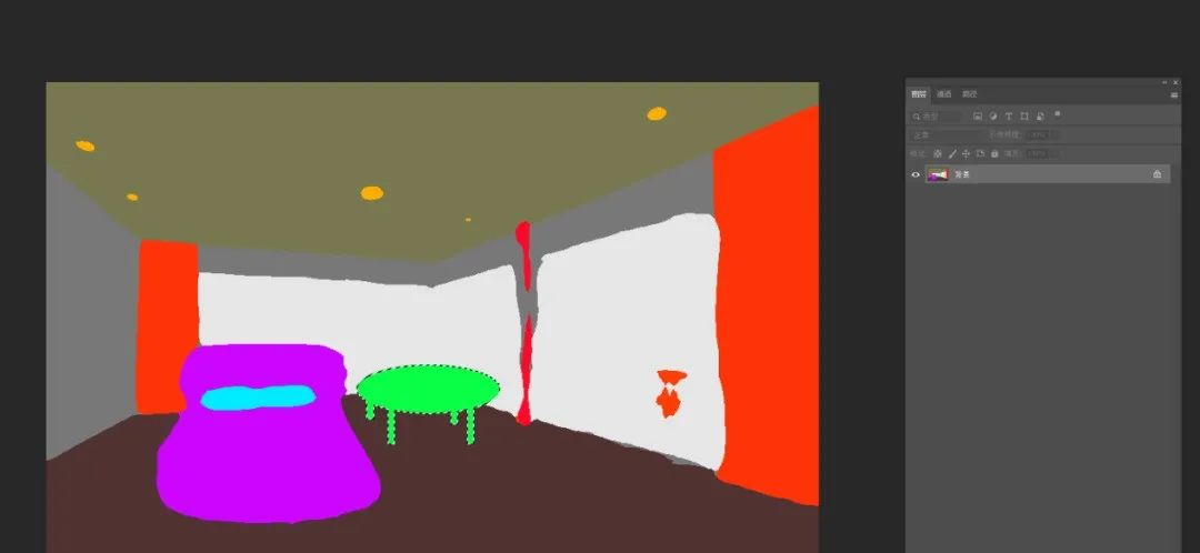 5.现在我们想在床边添加一张桌子,先保存Seg预处理效果图,并将其导入Photoshop,简单画出桌子的轮廓,颜色参考ADE20k色号表,选择将第34行“desk桌子”,将它的色号#0AFF47复制出来,填充进轮廓中。