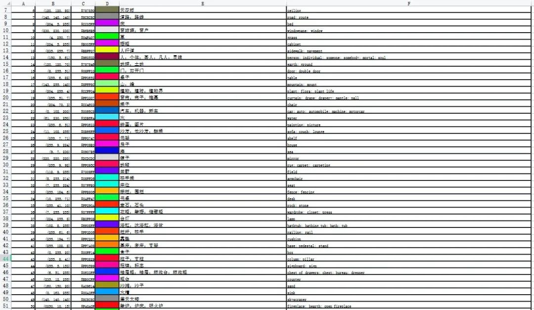 4.这里小编分享一个ADE20k协议的色号表,里面记录了不同的颜色所对应的材质或物件,大家也可以到LoveGPU官网内下载并使用。(文末领取完整色号表)