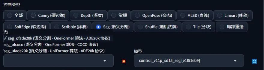 2.控制类型选择Seg(语义分割),在预处理器栏中我们可以看到有seg_ofade20k、seg_ofcoco、seg_ufade20k三种预处理器