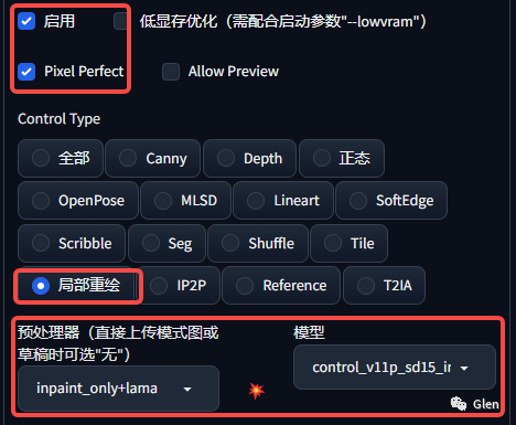 启用ControlNet单元0,勾选“启用”和“Pixel Perfect”