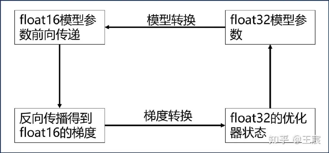 - 第三,float16 的梯度转换成 float32 的梯度,与 float32 的优化器状态,更新 float32 模型参数;