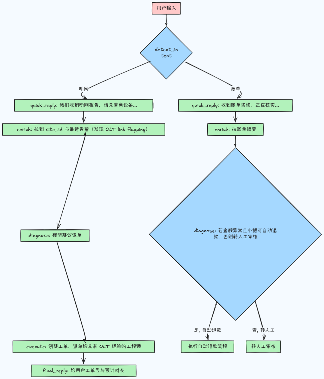 - diagnose -> 若金额异常且小额可自动退款,则执行自动退款流程;否则转人工审核。