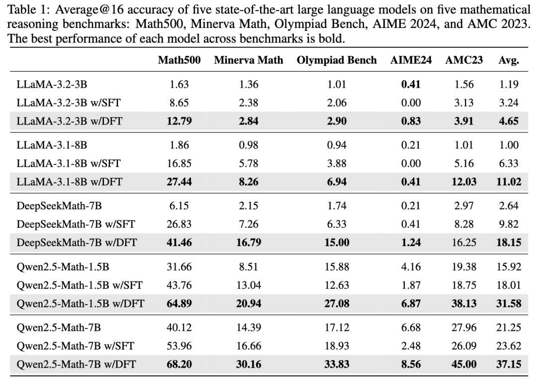 - 这个只需一行代码的改动,在多个数学推理基准测试中,让不同模型的性能都获得了远超传统 SFT 的提升,甚至在某些场景下超越了更复杂的强化学习方法。