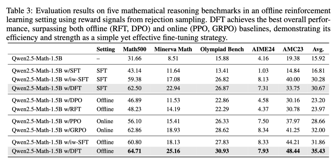 DFT 作为一个极其简单的微调方法,其性能不仅超过了 DPO、RFT 等专门的离线 RL 算法,甚至还超过了 PPO、GRPO 这种更复杂、需要在线交互的在线 RL 算法。