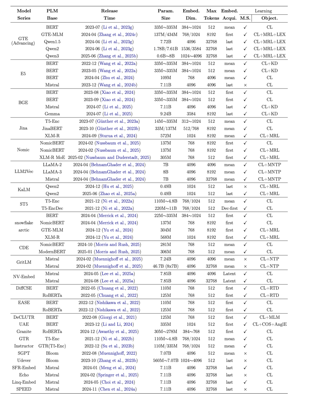 今天来聊聊一篇干货满满的综述论文《On The Role of Pretrained Language Models in General-Purpose Text Embeddings》(链接:https://arxiv.org/pdf/2507.20783)。这篇论文聚焦通用文本嵌入(GPTE),从架构到数据再到多模态、Code,深入浅出地讲解了文本嵌入的奥秘。