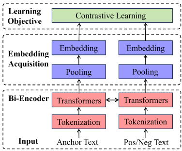 通常,文本单词序列被输入到一个成熟的PLM骨干(关键的神经网络是变压器),生成单词的隐藏上下文表示。接下来,一个池化步骤将这些单词级别的隐藏向量聚合成一个单一向量,得到输入文本的嵌入形式。