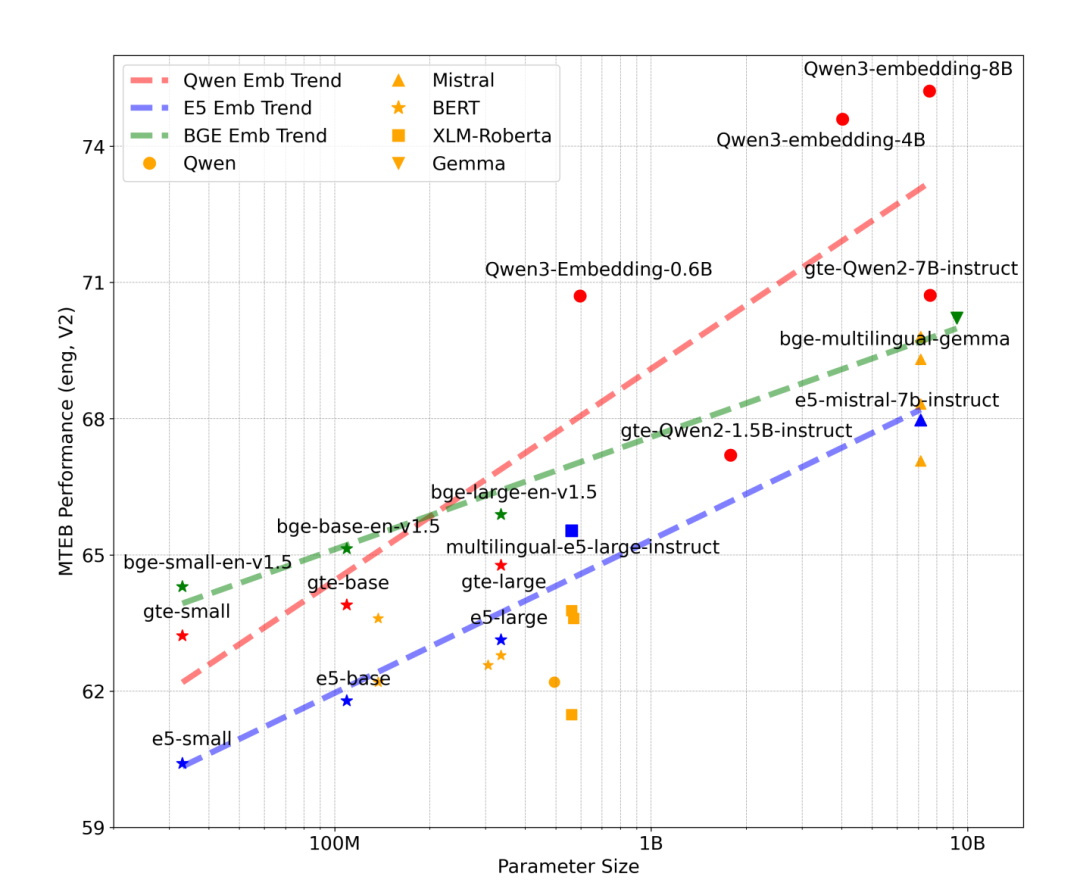 具有庞大参数和广泛预训练的大型模型在大型语料库上往往拥有更丰富的语义理解和更强的语言建模能力。因此,当为生成式预训练Transformer(GPT)模型进行预训练和微调时,增加模型规模通常也会带来更强大的文本嵌入效果,例如,gte-Qwen2-7B-instruct与gte-Qwen2-1.5B-instruct。如图2所示,规模效应已经证明,模型容量在很大程度上决定了所得到的嵌入模型的质量。