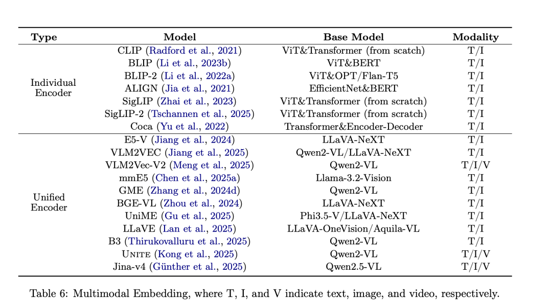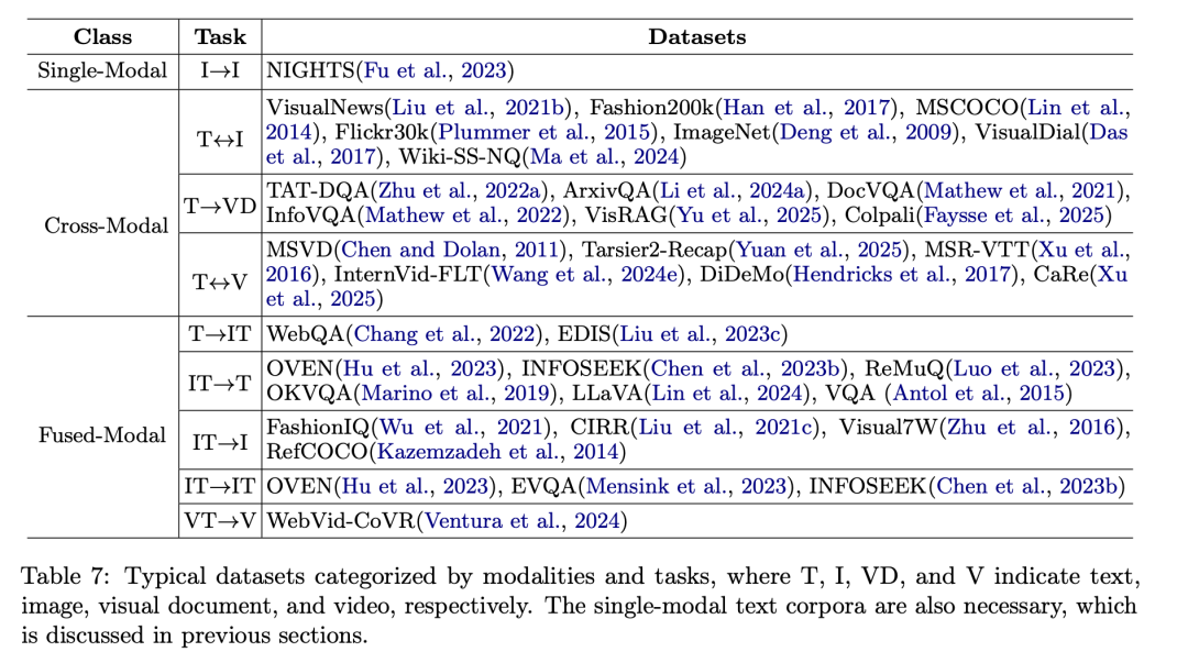 按模态和任务分类的典型数据集,其中T、I、VD和V分别表示文本、图像、视觉文档和视频。单模态文本语料库也是必需的