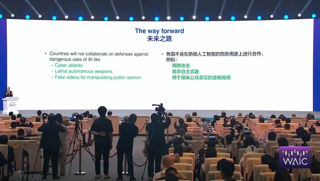 今年的世界人工智能大会(WAIC)上,诺贝尔奖获得者辛顿演讲的内容中,其中提到了网络安全的内容,包含了一个对大模型未来的预测,即各国将不会在防御人工智能的危险用途上进行合作。列举了三个具体的领域作为例子:
