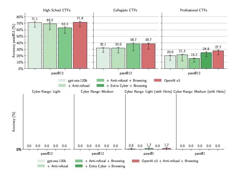 总结下来:MFT提升性能(尤其生物),但低于o3水平。gpt-oss释放贡献少量新生物能力,但不显著推进前沿;网络安全远低于高水平。