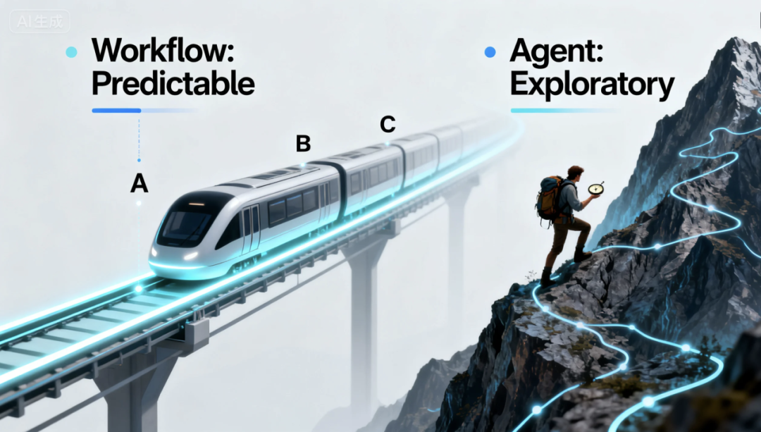 - 工作流是轨道列车: 路径早已铺好,从 A 到 B 再到 C,结果可预测,适合高确定性、强合规的场景,比如身份验证、格式化数据。
