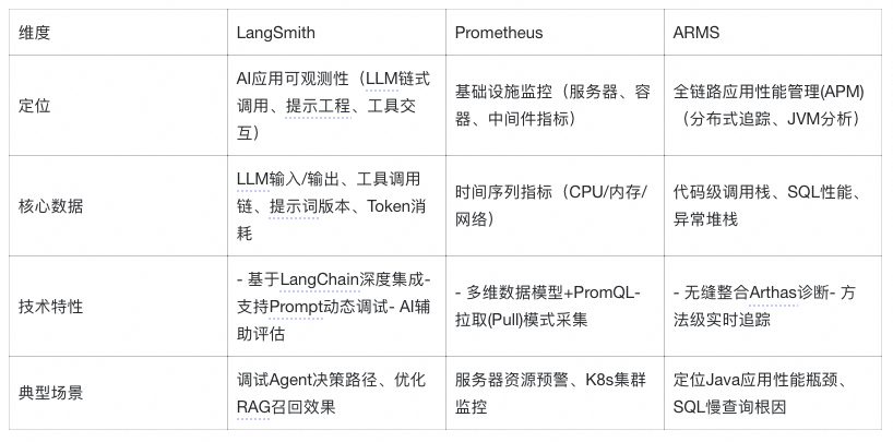 这样的工具非常强大,它能让我清晰地看到 AI 的每一次思考、每一次工具调用 。但是缺少根因定位,比如能够分析错误链路(如工具调用失败→Token超限→LLM超时)。可能大模型调用发生错误或者停止了,但LangSmith 里的 AI Trace 一片祥和,所有步骤都是绿色的,而我可能需要猜测这一次是不是token超限了。