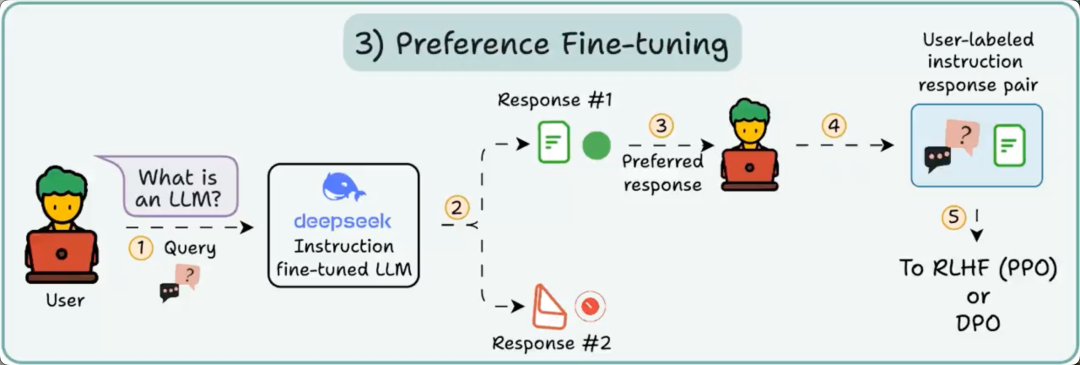 随后训练一个奖励模型来预测人类偏好,并使用 RL 更新 LLM。