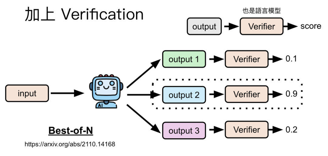 - 验证器(Verifier / Best-of-N): 训练一个模型(或直接用一个强大的语言模型)来评估每个答案的正确性,然后选择分数最高的那个答案(Best of N)。训练验证器的数据可以通过比较模型生成答案和标准答案来获得。
