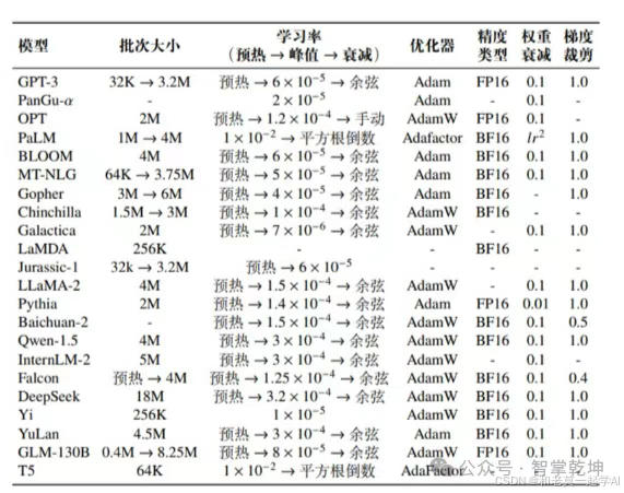 下表展示了现有大语言模型的详细优化设置。