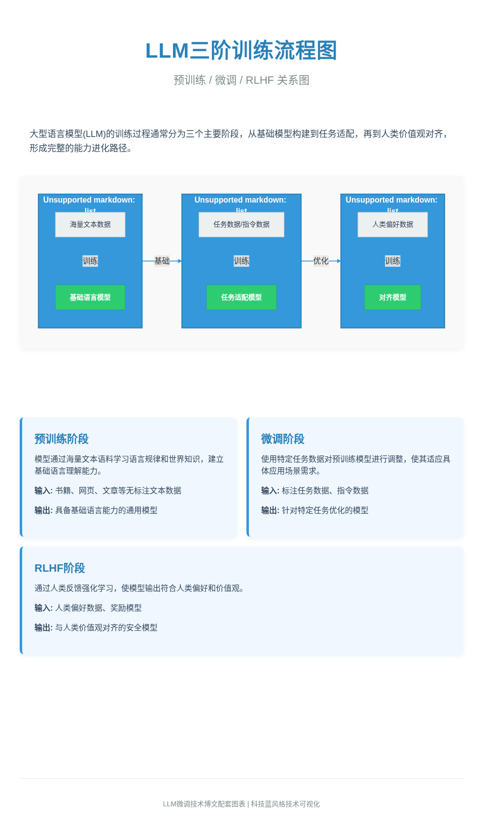 三个阶段通过参数传递箭头紧密连接:预训练模型的参数作为微调阶段的初始值,微调后的参数又成为RLHF阶段的优化起点,形成“基础能力→任务适配→价值对齐”的递进关系。