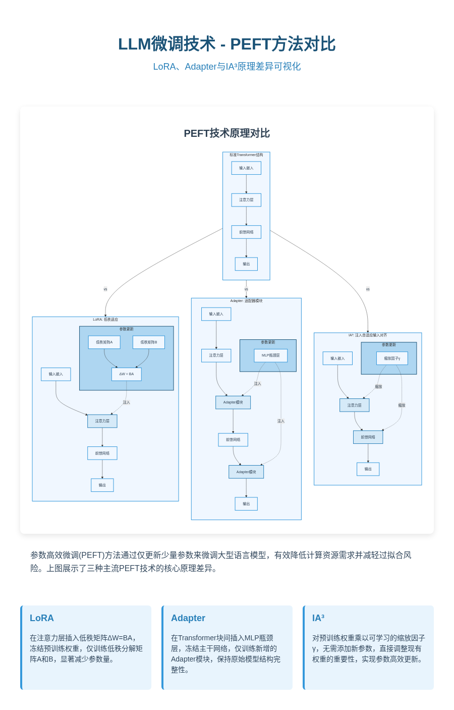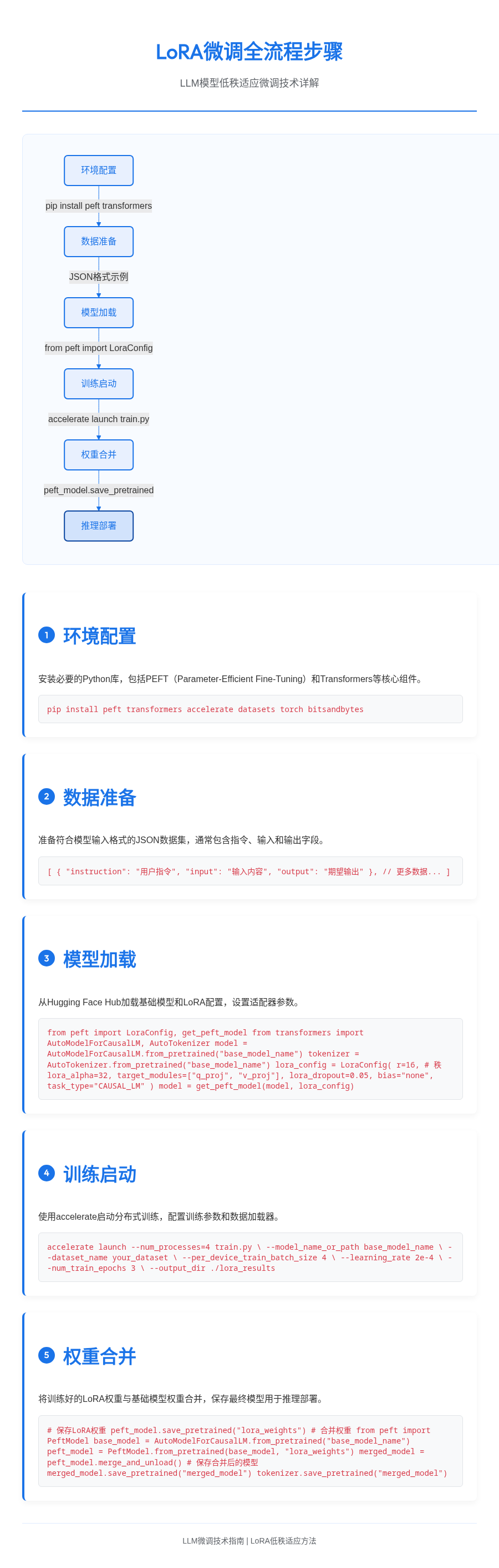 - • 参数高效微调(PEFT):仅更新部分参数(如 LoRA 通过低秩矩阵分解更新注意力层参数),可降低显存需求 90% 以上,典型方法包括 LoRA、QLoRA 等[1]。
