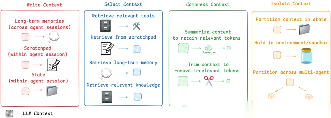 上下文工程的实践核心在于对上下文进行智能的写入(Write)、选取(Select)、压缩(Compress)和隔离(Isolate)。