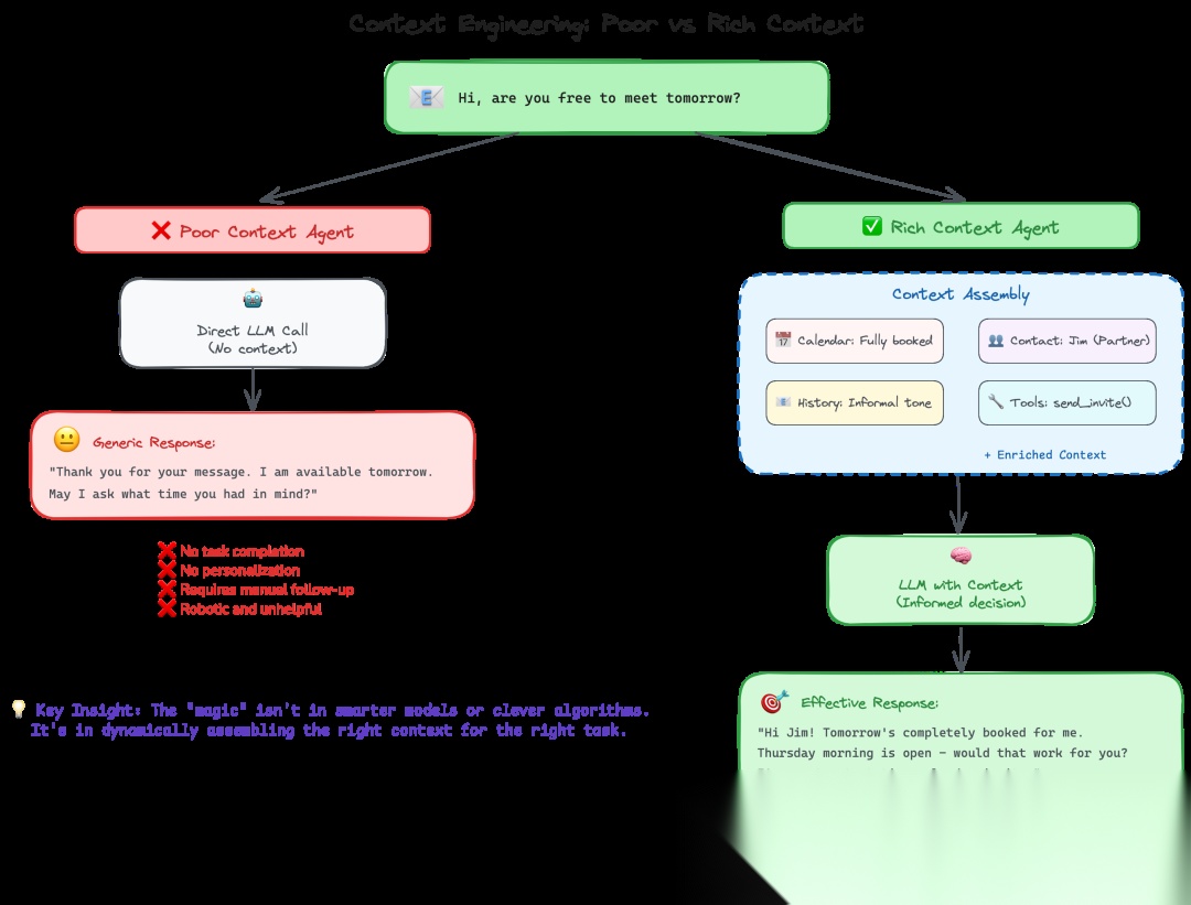 - 上下文贫乏的 AI: “感谢您的消息。我明天有空。请问您希望约在什么时间?” (无效回复,未推进任务)